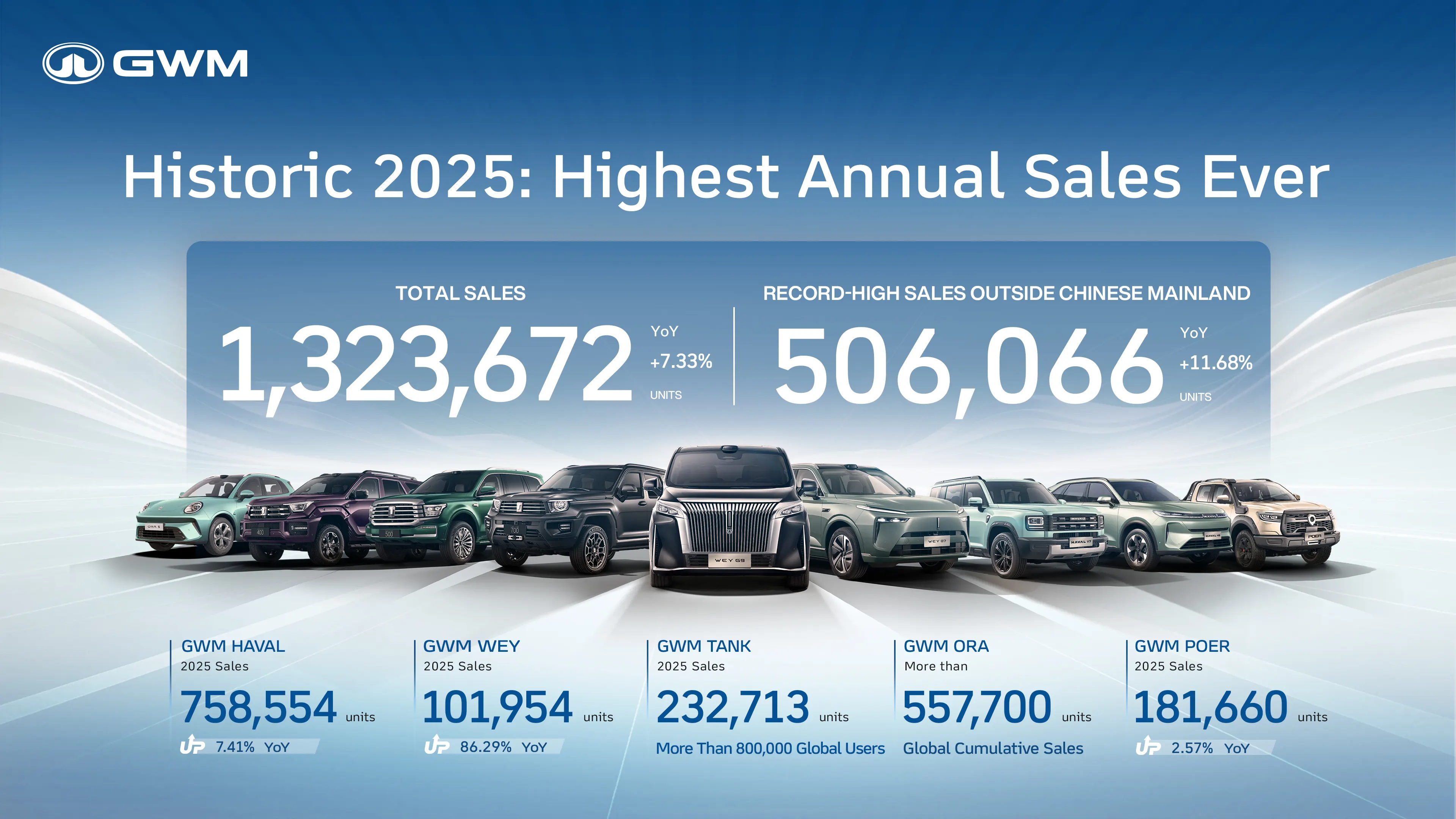 GWM TANK registró 232,713 unidades vendidas en 2025, manteniendo un crecimiento interanual estable, con ventas acumuladas globales superiores a 800,000 unidades. GWM ORA alcanzó ventas acumuladas globales de 557,744 unidades. En diciembre de 2025, se lanzó en China el GWM ORA 5, un SUV 100% eléctrico. Guiado por una filosofía de diseño inspirada en la estética natural, recibió el máximo reconocimiento en los London Design Awards: Design of the Year. ORA 5 es el primer vehículo de producción masiva a nivel global en obtener este premio desde que existe. Este año, llegará a mercados globales que incluyen Europa, Australia, América Latina y Medio Oriente, con múltiples opciones de tren motriz como BEV, HEV e ICE.